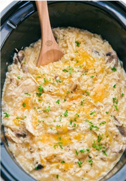 30 minutes before done, add in sliced mushrooms and finish cooking. Once done add in cooked rice and cheese. Cover and let sit 5 minutes for cheese to melt, stir and garnish with parsley. Serve warm.